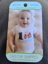 The Custom Snappies Gift Card is a $50 gift card that can be used to purchase customizable baby bodysuits. With no expiration date, it can be used at any location nationwide in the United States. The gift card allows parents to choose the specific design and personalization they want for their baby's bodysuit, making it a thoughtful and unique gift for new parents.