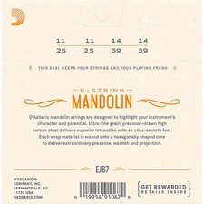 D'Addario EJ67 mandolin strings are great for electric or acoustic mandolin playing. J67 mandolin strings are wound with nickel-plated steel, known for its distinctive bright tone and excellent projection. D'Addario mandolin strings are trusted by legends like David Grisman, Ricky Skaggs, Ronnie McCoury, Doyle Lawson, Rhonda Vincent, Mike Marshall, Adam Steffey, and more, for their natural acoustic tone and reliable performance.