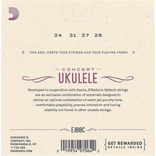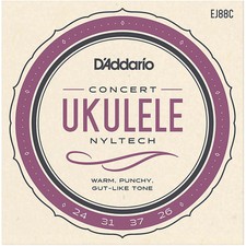 D'Addario EJ88C Nyltech Concert Ukulele string sets are designed for use with all concert ukuleles. Each string within this set is made from D'Addario's exclusive Nyltech material and optimized for standard GCEA tuning. Developed in cooperation with Aquila, D'Addario Nyltech strings are an exclusive combination of materials designed to deliver an optimal combination of warm, yet punchy tone, comfortable playability, precise intonation and tuning stability not found in other ukulele strings. Made in the USA for the highest quality and performance. Gauges: .024-.031-.037-.026.
