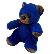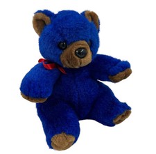 Dark Blue Teddy Bear Plush Two Tone Stuffed Animal in Red Bow. Item is in gently played with pre-owned condition. Light wear on nose. 8" wide at widest point.
