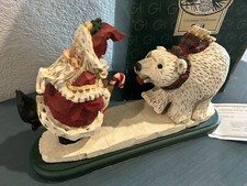 This charming and whimsical vintage 1996 David Frykman figurine features Santa Claus with a polar bear following Santa attempting to lick a candy cane. The multicolor resin figurine is perfect for the holiday season and comes with a certificate of authenticity. It is a great addition to any collection and a wonderful gift for anyone who loves seasonal and holiday-themed items. The figurine is made by David Frykman, a well-known artist in the collectibles industry. This piece is a must-have for anyone who loves collecting figurines and wants to add a unique piece to their collection. Measures 13.5 inches long . Heavy .In original box .Box shows shelfwear.