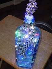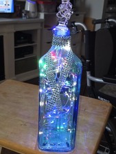 This lovely decorative bottle has a blue tinted glass originally containing botanicals. The rectangular bottle can be used as decoration, in a collection, or as part of an artistic craft project. It stands about 12" tall at its mouth, with each surface about 4" wide.