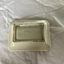 This decorative floral ceramic rectangular ashtray from Japan features a vibrant orange, white, and gold color scheme with a glossy finish. The ashtray is designed with a traditional rectangular shape, making it a stylish and functional addition to any space. The printed backstamp indicates its Japanese origin, adding a touch of authenticity to the piece. Suitable for cigarette ash, this ashtray combines practicality with decorative flair, making it a unique and eye-catching piece for any collection. 3 1/2" x 2 3/4"