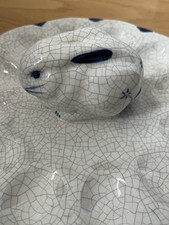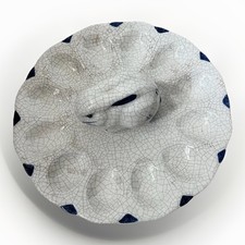 This 9" Dedham Pottery Bunny Rabbit Deviled Egg Plate features a charming crackle finish in a lovely blue and white. Hand-painted and decorated, this stoneware plate showcases a round shape with 12 compartments, perfect for serving deviled eggs or other snacks. Made in the United States by the renowned Dedham Pottery brand, this vintage piece adds a touch of artistry to any table setting. The glossy finish and hand wash only care instructions make it a beautiful and practical addition to your collection. Minor beige mark on back as shown