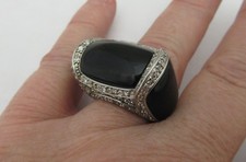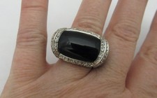 This is a unique ring with a large black onyx, and clear cz accents. This ring fits a finger size 7, and measures 27x16mm at the top. It is in excellent condition, sure to make a nice addition to your collection.