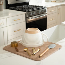 Dish Drying Mat, 16” X 18”, Absorbent Microfiber Kitchen Counter Mat, Drying Pad for Dishes, Utensils, Pots and Pans, Large, Diamond Texture, Almond. One S&T INC. Dish drying mat for kitchen counter protects surfaces from scratches and scuffs when placed under kitchen gadgets; multipurpose drying pads can be used as an appliance slider for a mixer or blender.