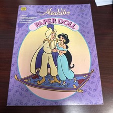 The Disney Aladdin Paper Doll Book from 1992 features a vintage design with a multicolor illustration of Aladdin's character. Made of good United States paper, this original Golden Books publication includes an uncut sheet for creating paper dolls. Perfect for fans of the Disney Aladdin franchise, this nostalgic book is a must-have collectible for anyone interested in dolls, paper crafts, or vintage Disney memorabilia.