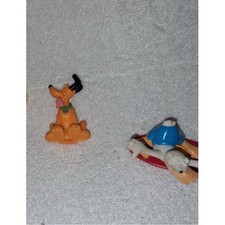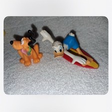This Disney set features a Donald Duck figure on a surfboard and a Pluto figure, both crafted from PVC. The figures are bright and colorful, capturing the classic Disney theme. The set includes both the Donald Duck and Pluto figures. Pre-owned condition. Keywords: Disney set, Donald Duck, Pluto, PVC figures, surfboard, colorful, Disney theme, collectible, pre-owned, Disney characters, toy figures, Disney merchandise.
