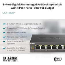 D-Link PoE Switch, 8 Port Ethernet Gigabit Unmanaged Desktop Switch with 4 PoE Ports 68W Budget (DGS-1008P),Black. POE CAPABILITY - Four of the eight Gigabit ports are PoE compliant, supporting up to 30W per port with a total power budget of 68 Watts for connected devices.