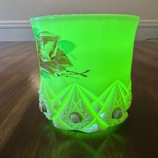 The product is an antique EAPG Jefferson CUSTARD GLASS SPOONER featuring a Diamond & Peg or Star Pattern. Hand painted with a glossy finish, this original piece of pressed glass was produced in the United States. The multicolor custard glass spooner is a vintage collectible from the Jefferson Glass brand, making it a unique and decorative addition to any pottery and glass collection. Thank you Aaa