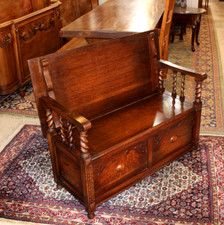 English Antique Jacobean Carved Oak Bench w/ Storage / Table