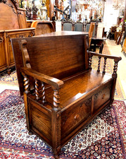 Measurements: 35" Height x 42" Width x 19" Depth x Seat H 17" This English antique oak Jacobean bench region showcases finely detailed hand-carved oak panels . Crafted the late 19th to early 20th century, this hall seat features intricate carvings opens to reveal a spacious storage compartment, perfect for blankets, shoes, or entryway essentials.
