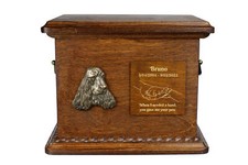 English Cocker Spaniel, English Cocker Spaniel I Personalized dog urn with engraving and relief, keepsake box for dog bones from the Art-Dog brand We know well that nothing can comfort you on this saddest day. We are here to help you say goodbye to your beloved dog. We present a collection of urns with almost 40 dog breeds. The urn is personalized. Give us your dog's name, date of birth and death and we will engrave it and create your unique memory. The quoted quote can also be changed. The birch wood urn is durable. It has brass handles, a removable lid and decorations in the shape of a wreath. The lid has no closure or seal. In order to permanently close the urn, the lid must be glued. The bas-relief sculpture of the dog is made with great care for the characteristic details of each bre.