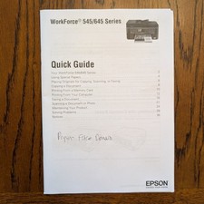 The Epson Workforce Series 545/645 Printer Manual / Quick Guide and Software Disc with drivers OEM for this Epson printers. This manual and CD set provides comprehensive guides and software drivers specifically designed for the WorkForce 545/645 printers. The quick guide, software disc and quick set up sheet offer a convenient way for users to learn about and manage their Epson printer efficiently. See photos for minimal writing on manual cover.