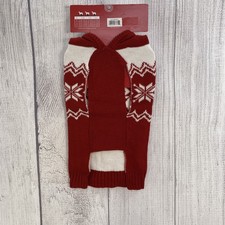 Fair Isle Christmas Dog Sweater LARGE Red White Nordic Hooded Pom Pom Snowflakes