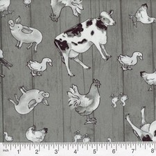 The product is a cotton fabric featuring a farm animals pattern in gray color, perfect for quilting projects. Ideal for creating cozy and colorful quilts or crafts related to farming, this material brings a touch of charm and whimsy to any project.