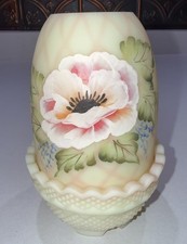 In excellent condition. No chips or cracks. The glow from UV light on this fairy is spectacular! Fenton Burmese Poppy GLOWS Diamond Optic 2 pc Fairy Lamp by J Dowler.
