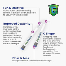 Easy-grip flossing tool designed for kids, caregivers, and anyone with limited hand dexterity or braces. Glide between teeth without the need to adjust floss length or tension like regular floss picks and promote better hygiene without putting fingers in your mouth.