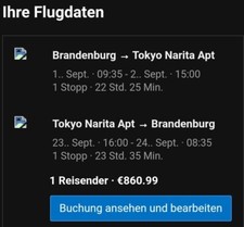 Der Rückflug erfolt am 23. September um 16:00 aus Tokyo und verläuft ebenfalls über Singapur. Landezeit ist 8:35 am 4. Die Reise selbst findet mit der Airline Scoot statt und beginnt am 01. September um 9:35 Uhr.