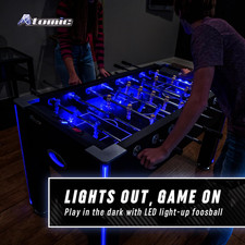 Lights out?. Light up the night with the illuminating technology of the Azure LED Light Up Foosball Table. To enhance the in-the-dark play experience, both the foosball and goal boxes light up with blue illuminating exterior legs.