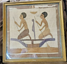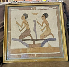Wonderful antique hand-stitched tapestry featuring iconic Egyptian figures in a boat. The piece, made of linen and cotton, is framed under glass. These type of appliqued tapestries were made in the 1920s by tent makers for sale to tourists visiting Egypt. Many were framed later, as is suspected of this piece due to the wear of some of the applique (please see photos for condition). A delightful art piece appliqued in a restrained neutral color palette that will compliment any decor or collection. This framed art was given to a nonprofit, so I don't have any additional history on it. The piece measures 20.5"x20.5". The frame is solid and in great shape.