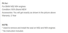 Introduction: Automotive tools and equipment are products that mechanics (or car owners) use when working on vehicles. They can be tools to keep parts and systems in good condition, popularly called maintenance tools, or tools to fix problems such as those used to remove and install fasteners. Fit for: For BMW N52 N54 engines Condition:100% Brand NEW Accessories: You will get exactly as shown in the picture above Warranty: 2 Year NOTE: * Used to remove and install the seal on N52 and N54 engines * No Instruction Included. Brand Unbranded Type Car Parts UPC Does not apply MPN Does not apply Item Length 15.563 Item Width 11.032 Item Height 6.698 Weight 8.14 Color Beige Material Corduroy .