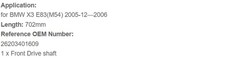 Application: For BMW X3 L6 152 2.5L (2494cc); Automatic Trans. Front From 12/05; 702 mm 2006 For BMW X3 L6 3.0L (2979cc); Engine Desg. M54; Automatic Trans. Front From 12/05; 702 mm 2006 Specification Condition: New Location: Front Side Material: Steel Drive Shaft Total Length (In): 27.63 Drive Shaft Stretching length (In): 0 Drive Shaft Compressed length (In): 27.63 Drive Shaft Wall Thickness (In): 0.083 Drive Shaft Diameter (In): 1.5 Greaseable Drive Shaft: No Overall Length Adjustable: No Package Quantity: 1 Packaging Type: Box Fitment Type: Direct Replacement Reference OEM Number: 26203401609, 936-304, 936304 Note:Vehicle Note-1: It fits the model built From 12/05 Vehicle Note-2: It fits Automatic Transmission Only, Not Manual Transmission Code:M.
