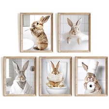 Funny Bunny Bathroom Wall Art 5pcs Bundle Easter Rabbit 10L" x 8W" Rabbit 5pcs