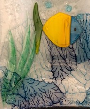 Ocean plants and fish are fused glass – raised. Fused glass bubbles at top. Blue and yellow tropical fish with green tail swimming on ocean floor. Original label on underside. “AR Design Collections”.