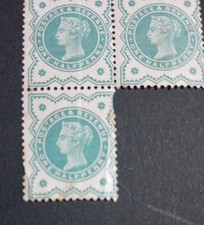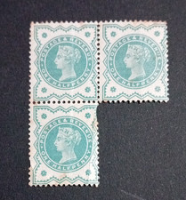 GB QV 1887 Jubilee 1/2d Blue / Green Block of 3 stamps Imperial Crown Watermark Mint Never Hinged Crease and some foxing of paper on reverse, some damage to stamps as shown in pictures Original gum