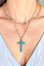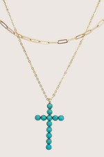 Cross, inspirational, layered, chain necklace, necklace set, gem, gemstone, gem cross, tq, turquoise, western, cowgirl, cowgirl style, western necklace, religious. Double Row Bead Cactus Necklace Set.