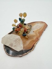 • Gemstone chip bonsai tree. A clear quartz crystal accent is also attached to the base. Decorative Gemstone Tree on Natural Agate Slice Base. • Natural agate slice base. Good pre-owned condition. Minor natural variations in stones and agate typical for this type of item.