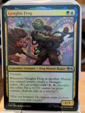 The Genghis Frog #148 (Foil) card is a collectible card from the Teenage Mutant Ninja Turtles set of Magic: The Gathering. This Legendary Creature card features a Frog Mutant Rogue creature type with a rarity of Uncommon. Manufactured in 2026, the card is in English language and illustrated by Zoltan Boros. The card has a mana cost of GU and is made of durable card stock with a foil finish, adding a special touch to any Magic: The Gathering collection.