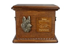 German Shepherd I Personalized dog urn with engraving and relief, keepsake box for dog bones from the Art-Dog brand We know well that nothing can comfort you on this saddest day. We are here to help you say goodbye to your beloved dog. We present a collection of urns with almost 40 dog breeds. The urn is personalized. Give us your dog's name, date of birth and death and we will engrave it and create your unique memory. The quoted quote can also be changed. The birch wood urn is durable. It has brass handles, a removable lid and decorations in the shape of a wreath. The lid has no closure or seal. In order to permanently close the urn, the lid must be glued. The bas-relief sculpture of the dog is made with great care for the characteristic details of each breed. The classic style makes the.