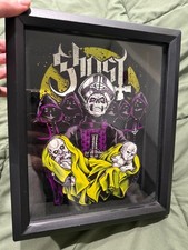 Cool shadow box with Ghost band artwork. Features a Papa figure, hooded figures, and two babies/skulls wrapped in yellow. Has a black frame.