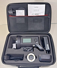 The unit has been used only briefly for testing and hasfewer than 100 flash firings. Godox AD400 Pro flash unit. Built in Godox 2.4G wireless system. This is a powerful and compact professional strobe ideal forstudio work, outdoor photography, product photography, and location lighting.