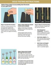 This listing is for Gold Silver Platinum Testing Kit 10K 14K 18K 22K .999 Silver Platinum Stone purchase includes the following: 10 Karat Gold Testing Solution 14 Karat Gold Testing Solution 18 Karat Gold Testing Solution 22 Karat Gold Testing Solution Silver Testing Solution Platinum Testing Solution 3x6 Black Testing Stone, Detailed instruction booklet. The gold solutions will allow you to determine the karat rating of your gold piece to know if it is 9K 10k, 12k, 14k, 18k, 20k or 22k-24k. The silver solution will allow you to determine if your silver is either .999 pure silver or .925 . Each bottle contains enough solution for 30-40 tests. Please refer to photo for more details as they are the best part of the description.