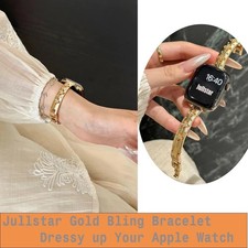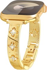 Compatible with various Apple Watch sizes: 38mm, 40mm, 41mm, 42mm, 44mm, 45mm, 46mm, 49mm. Stylish gold stainless steel design for a dressy look. Includes a bling silver leopard pattern for added flair.