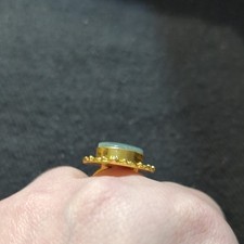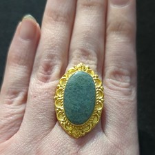 Gold Tone Green Moss Agate Gemstone Oval Statement Ring - size 9. This stunning statement ring features a beautiful green moss agate gemstone set in an intricate gold design. Perfect for adding a touch of elegance to any outfit.