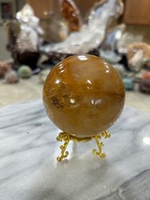 Beautiful Golden Healer sphere on gold tone stand.