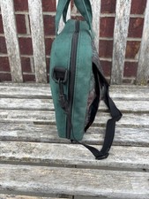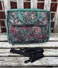 Nice Bible cover by Gregg, from the 1990’s, made in the USA from canvas fabric with green sides and back and a dark floral tapestry-looking front. It features carrying handles, detachable and adjustable strap, roomy front Velcro flap pocket and zipper closure.