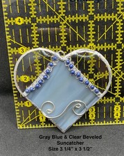 Blue Grey Stain Glass Heart. This heart will catch any person eye. Made of Blue Grey Glass and Clear Beveled Glass. Is decorated with twisted silver wire and blue beads. Very unique piece.