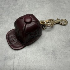 This is a cap-shaped leather keychain by Gucci. It features high-quality burgundy leather with an embossed GG logo. The design is both luxurious and playful. Title: Gucci GG Embossed Leather Cap Keychain.