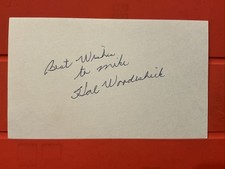 The product is a autographed index card featuring MLB player Hal Woodeshick.