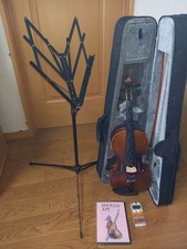 This complete violin set is perfect for students and beginners alike. It includes essential accessories to get started right away: a protective case, a foldable music stand, an unopened teaching CD, and a tuner.