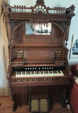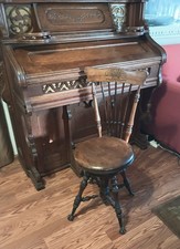 Beautiful functioning pump organ. Handles on the sides and casters make it easy to move around the "parlor" for entertaining your guests. Includes the original correct organ stool with back support.