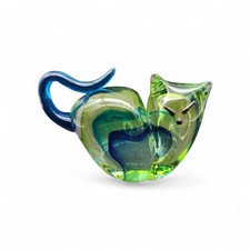 This hand-blown glass cat figurine is a beautiful and unique collectible piece, featuring a royal blue and green color scheme. Crafted with care and attention to detail, this figurine showcases the artistry of handcrafted glasswork. Made in the United States, this piece adds a touch of elegance and charm to any cat lover's collection. Minor scratches noted. Measures 4"×6.5"×2.5". Base is 2.5" in length and well balanced. Please see photos for details and condition.