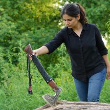 This handmade axe is a must-have for any collector or outdoor enthusiast. Crafted from high-quality carbon steel, this ambidextrous axe features a wooden handle leather wrap comfortable use. The black color and original design make it a unique addition to any collection. Overall length : 19” inch Blade : 5.5” inch Head width : 6.5” inch Perfect for tactical use, camping, battle, or throwing, this Norse Ragnar Tomahawk Axe is a versatile and durable tool. It is hand-forged and authentic, making it a valuable addition to any collection. Whether you're a collector or an adventurer, this axe is sure to impress.