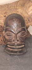 One-of-a-Kind, hand carved Mwana Pwo Chokwe mask handmade by artist in Angola. The face features traditional scarification marks on the forehead and cheeks as symbols of beautification. The hair, one of the most dramatic features, is loose raffia over a braided cap so the mask can be worn during dance rituals.
