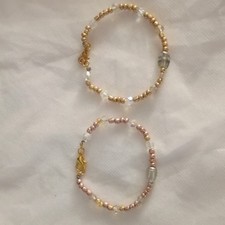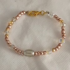 Handcrafted Beaded Bracelet, Gold Pink Clear Glass Round Beads, Lobster Clasp